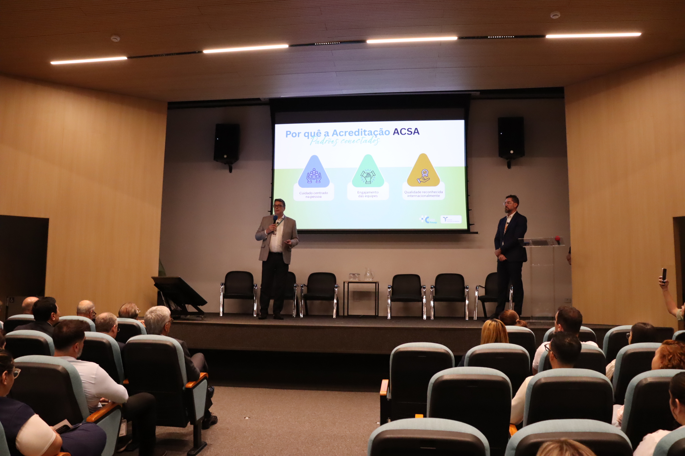 Na apresentação, o Dr. Eduardo Santochi, Diretor Executivo, e Dr. Douglas Crispim, Diretor Clínico, listaram como raízes sólidas para o atingimento da acreditação: o legado institucional do Hospital das Clínicas da FMUSP, a excelência assistencial, governança acadêmica e modelo de gestão integrado baseado em princípios de eficácia, transparência, princípios jurídicos, em conjunto com a FFM, enquanto Organização Social de Saúde.