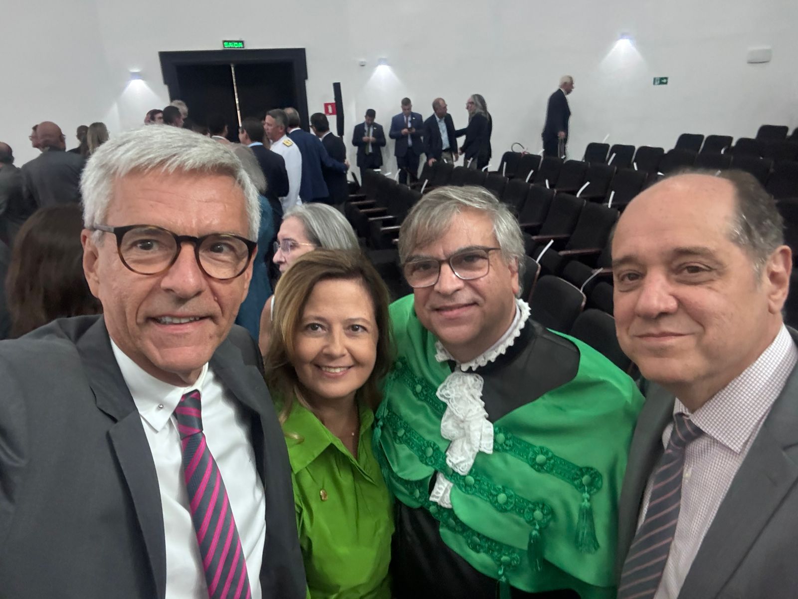 "A combinação entre saúde, engenharia, ciência e gestão pública expressa bem a agenda de integração e modernização assumida pela nova Reitoria”, destacou a Profa. Dra. Eloisa Bonfá, diretora da FMUSP e presidente do Conselho Curador da FFM, em sua saudação, em nome do Conselho Universitário. O Diretor-Presidente da FFM, Dr. Arnaldo Hossepian Junior, e o Vice-Diretor-Presidente, Prof. Dr. Tarcisio Eloy P. Barros, também prestigiaram a cerimônia, que contou com diversas autoridades governamentais e diplomáticas, representantes de instituições de ensino etc. Na foto (à esquerda), Hossepian está